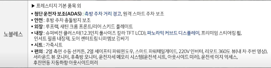 안전성 강화를 위해 기존 8개의 에어백에서 2열의 사이드 에어백이 추가되어 총 10개의 에어백이 제공되며, 측방 주차거리 경고, 후진 가이드 램프, 디지털 센터 미러 등 GV80이나 팰리세이드에 적용이 되었던 옵션들을 가져와 보다 높은 상품성을 갖추게 되었습니다.