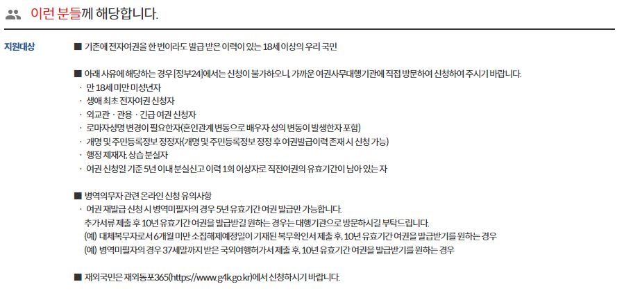 여권 재발급 온라인 신청을 하려면, 한 번이라도 여권을 발급 받은 이력이 존재해야 합니다. 그리고 만 18세 이상의 대한민국 국민이라면, 번거롭게 직접 방문을 하지 않더라도 온라인으로 여권 재발급을 신청 할 수 있습니다.