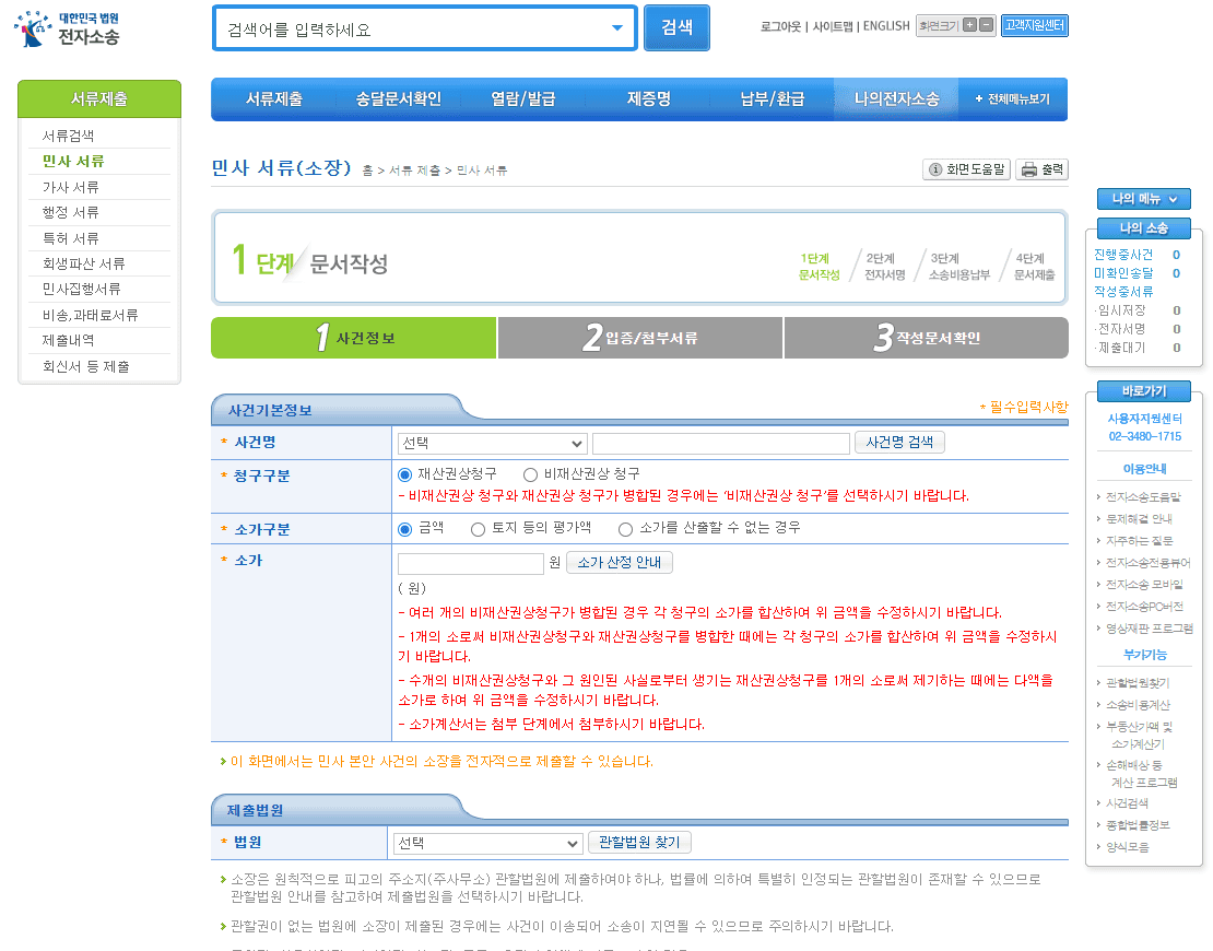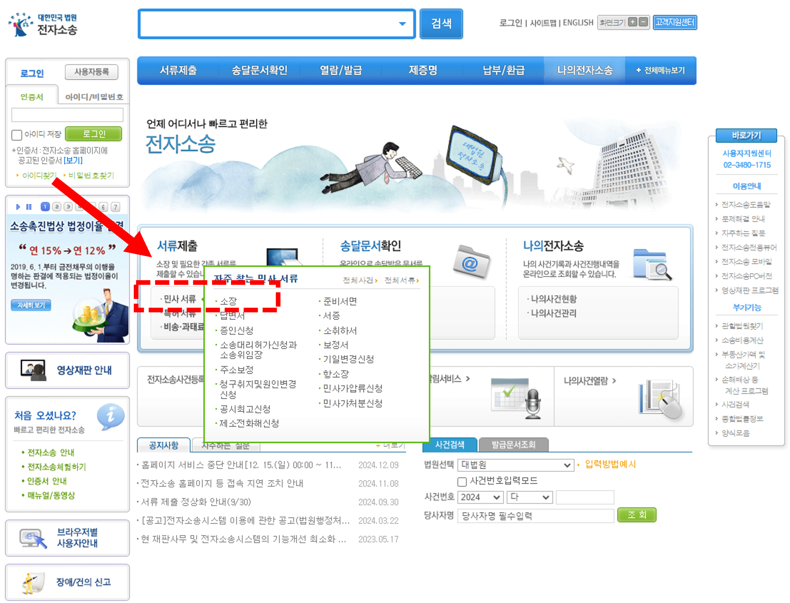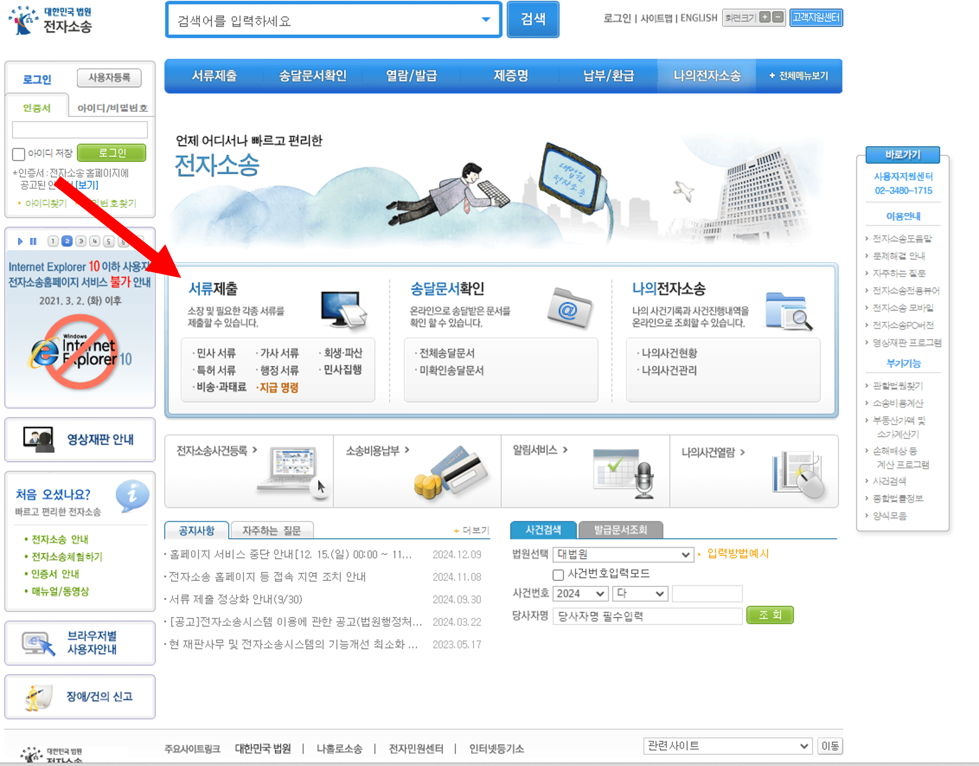 2. 사이트 가운데 부분 '서류제출 - 민사 서류' 클릭 한다.