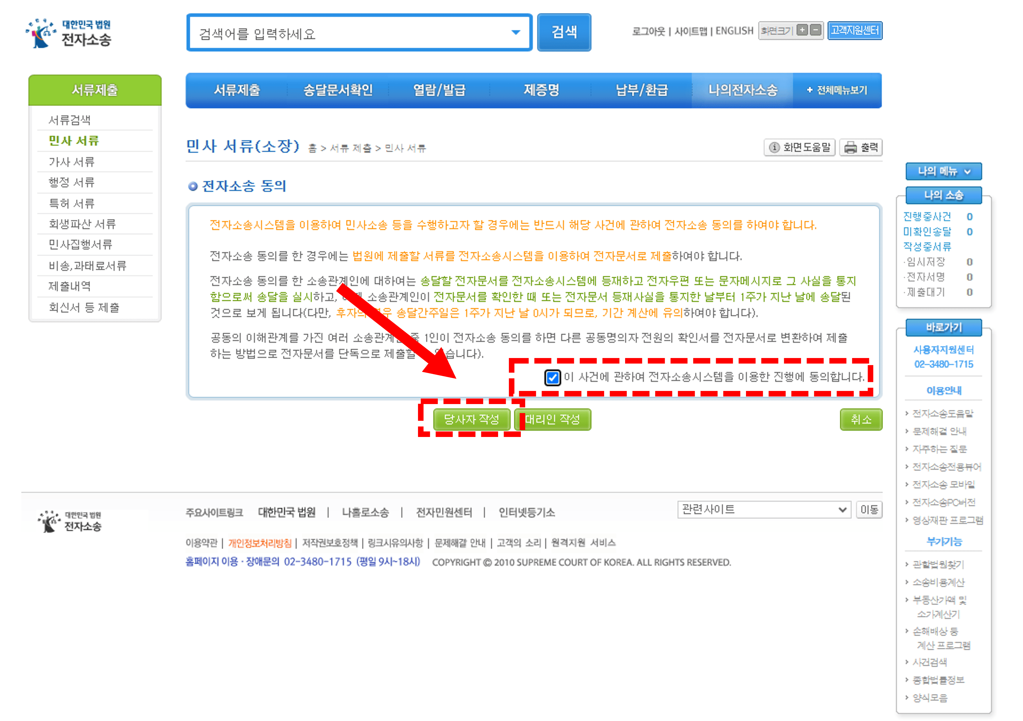 4. 전자소송 진행 동의하고 '당사자 작성' 클릭