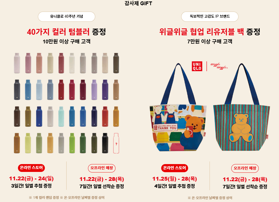 유니클로 40주년 감사제인만큼 실용적인 구매 고객 선물이 준비되어있습니다.