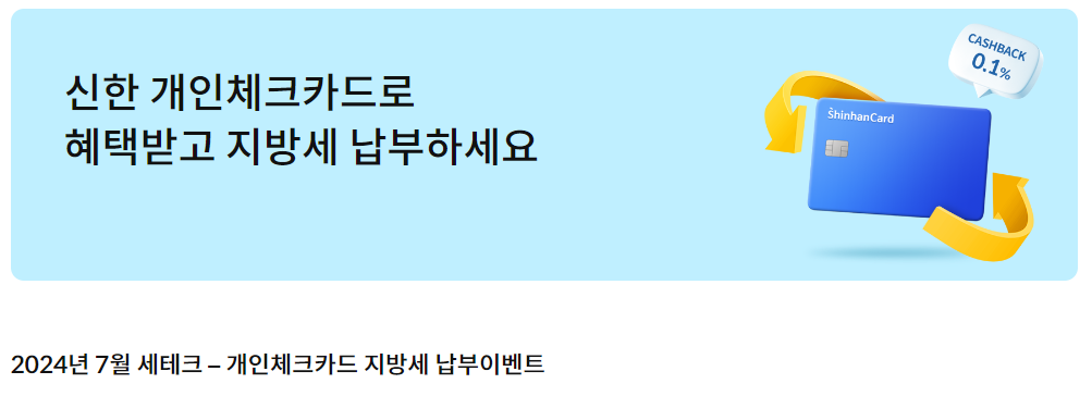 신한카드 지방세혜택은 비씨바로카드처럼 특정카드에 한정되는것이 아니고, 신한개인체크카드 모두가 지방세 카드 혜택을 받을 수 있습니다. 신한카드 지방세 카드혜택의 기간은 지방세 납부기한인 2024년 7월 31일 까지이며, 전체 납부금액의 0.1%를 현금으로 캐시백 해줍니다.