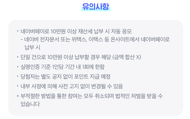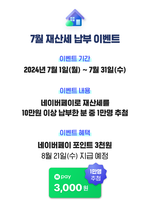 카드사는 아니지만 네이버페이에서도 네이버페이로 10만원 이상 재산세 납부시 추첨을 통하여 네이퍼페이 3천원을 1만명에게 지급하는 이벤트를 진행중입니다. 네이버페이를 자주 사용하시는 분이라면 참해보셔서 혜택을 받아보시는게 좋습니다.