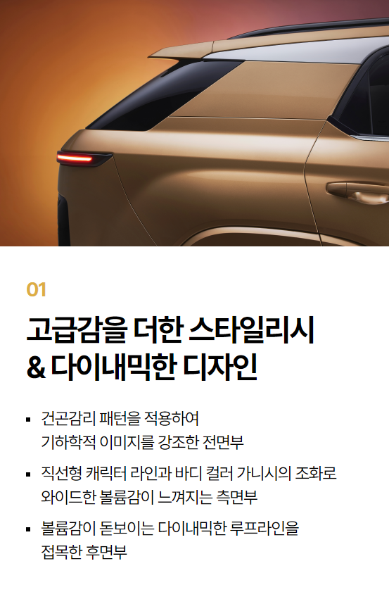 액티언은 KGM의 디자인 철학'Powered by Toughness'이 담겨있는 매력적인 도심형 SUV 인데, 외관은 SUV의 강인한 디자인을 보여준 토레스의 그것을 바탕으로 쿠페형의 아름답고 스타일리시한 실루엣을 느낄 수 있습니다. 또한 토레스에 비해 전고를 낮추고 전장은 널려 적재 공간은 최대화해 중형 SUV에 버금가는 수준의 실내공간을 제공합니다.